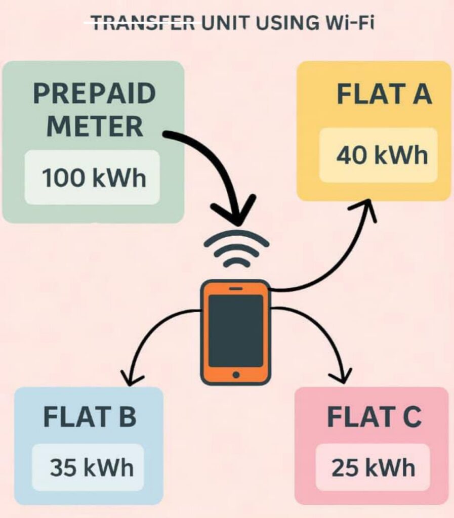The Smart Check Meter does not collect units. It only controls how much unit a flat can use from the same central meter.